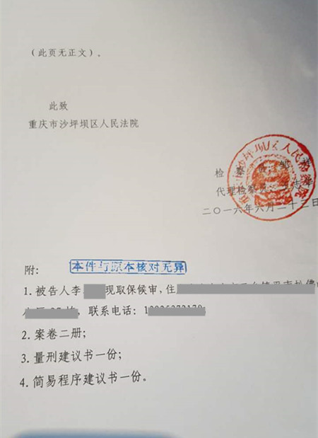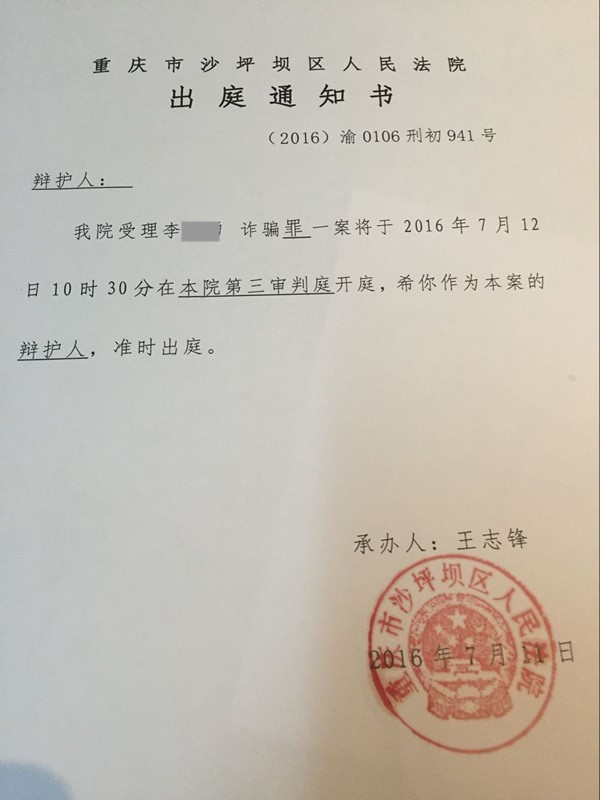 李某冒充国家机关工作人员,以政府采购为名,骗取供应商货款、定金共计13万元,雷启如律师在侦查阶段成功为其办理取保候审,2016年7月12日在沙坪坝法院开庭审判。