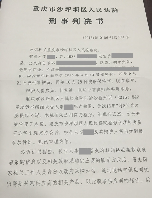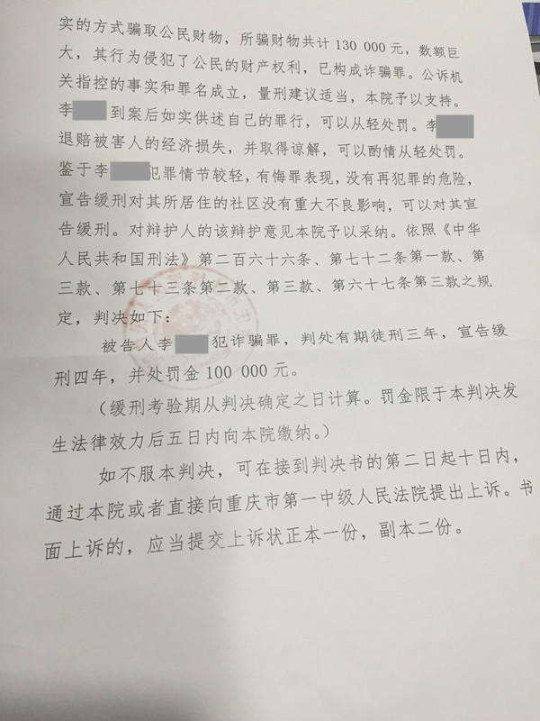 2016年8月8日李某诈骗案在沙坪坝法院宣判