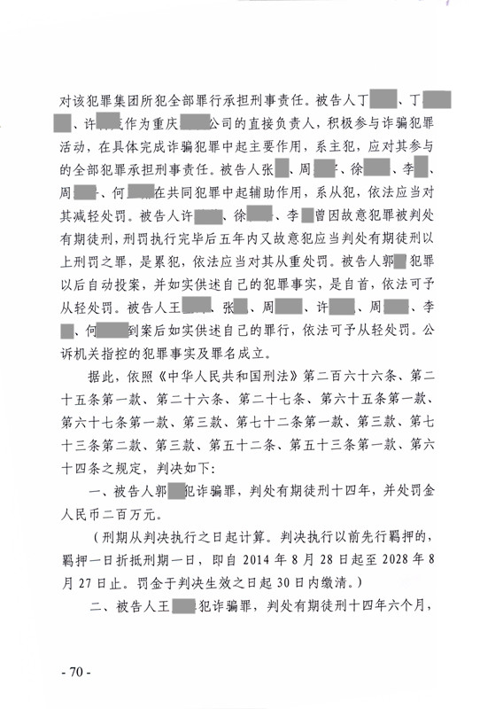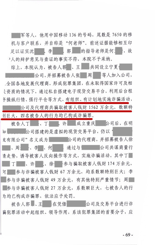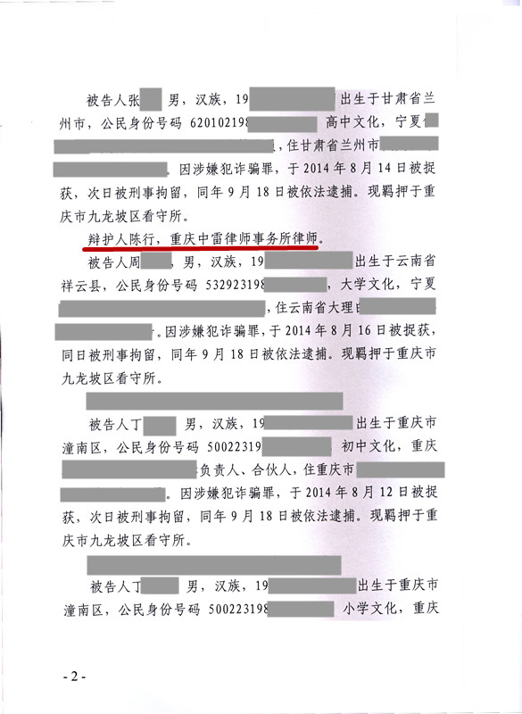 张某涉嫌诈骗,被九龙坡区人民检察院提起公诉。郭某、王某设立某某公司,招聘张某(后台程序操作员)、周某等人加入公司,无相关资质而私自搭建电子现货交易平台,张某在郭某周某等人的指导下对后台程序操作行情,强行平仓的方式,进行诈骗。承办律师介入案件后,指出张某虽然是共犯,但是诈骗金额与其犯罪所得明显不成正比,如果按照诈骗金额1562万余元定罪,显然违背刑法罪刑责相适应的基本原则,在公诉机关建议判处张某10年以上有期徒刑的情况下,案件经过数次的开庭辩护,承办律师凭借专业的办案技能与思维,最终张某被判三缓三。