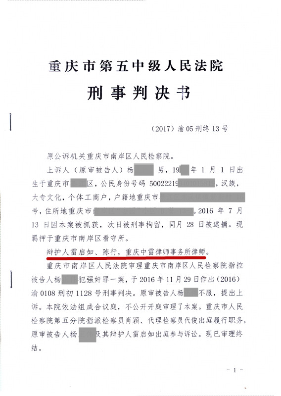 杨某某因涉嫌强奸罪,在重庆市南岸区人民法院一审审理。杨某某不服一审判决,委托中雷所律师提起上诉。在律师的努力下,二审法院减轻了杨某某的刑期。杨某某及其家人,对二审审判结果非常满意。