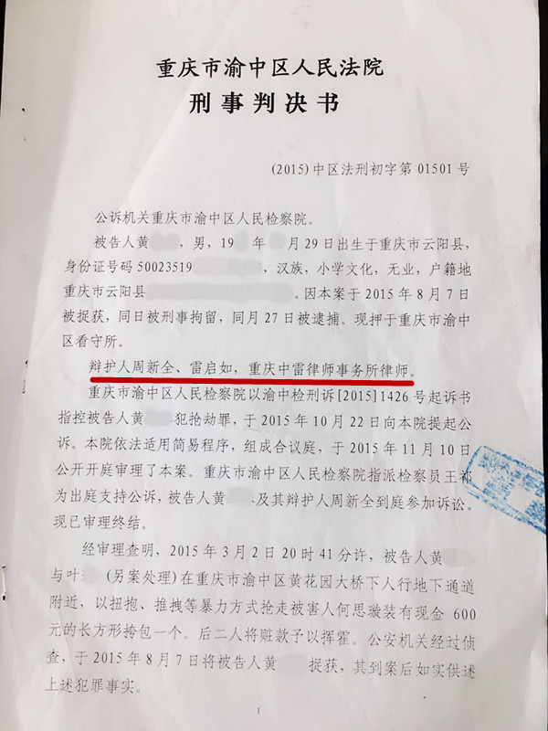 黄某伙同他人在人行地下通道附近设伏,抢走被害人挎包和现金被提起公诉。黄某的家属慕名前来中雷所,律师接收委托后在看守所多次会见黄某并且详细了解案件的情况。律师提出黄某系初犯,暴力程度轻微,有被害人谅解等情节,建议法庭适用缓刑被采纳。黄某及其家人对判决结果特别满意,对律师的辩护能力大为赞赏,辩护让黄某避免了至少3年的牢狱之灾。