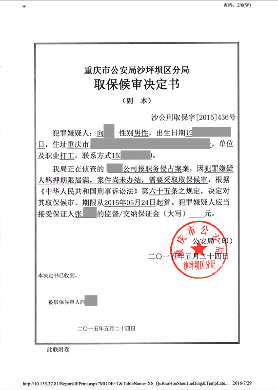 向某涉嫌职务侵占,涉案金额近100万元,被沙坪坝区公安分局刑事拘留。承办律师向办案单位提出取保候审的申请,案件尚未侦查完毕,且向某愿意退赃,最终办理取保。