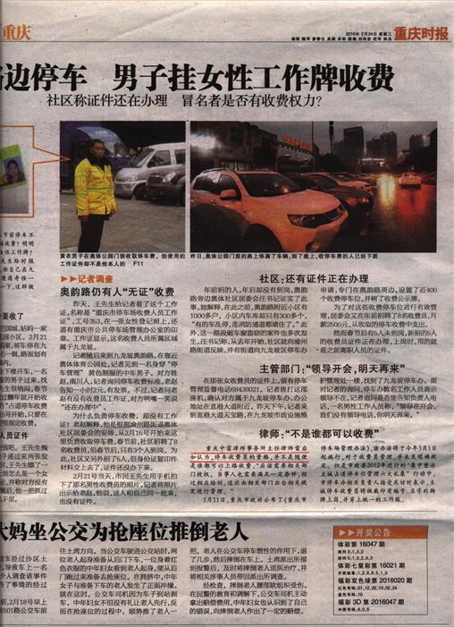 近日,马路旁边有人乱收停车费的现象被媒体报道后,迅速成为舆论热点。雷启如主任针对这一热点话题,从法理的角度发表了评论。这一评论,被2016年2月24日的《重庆时报》予以刊登转载。