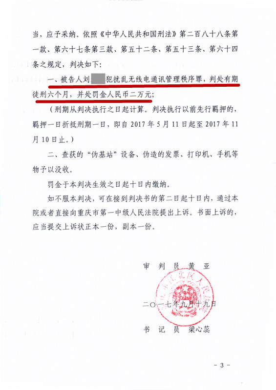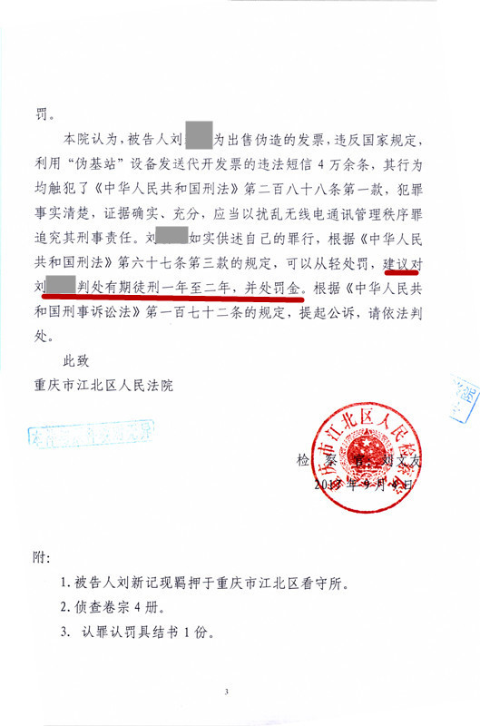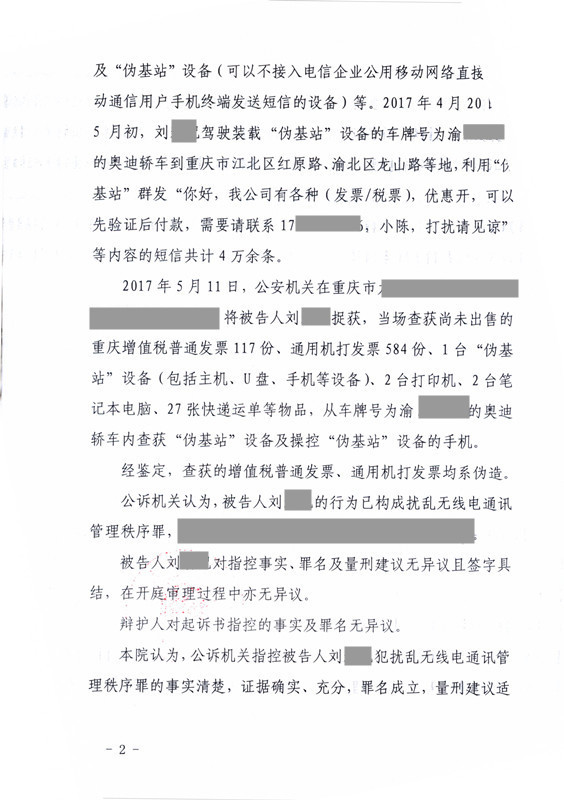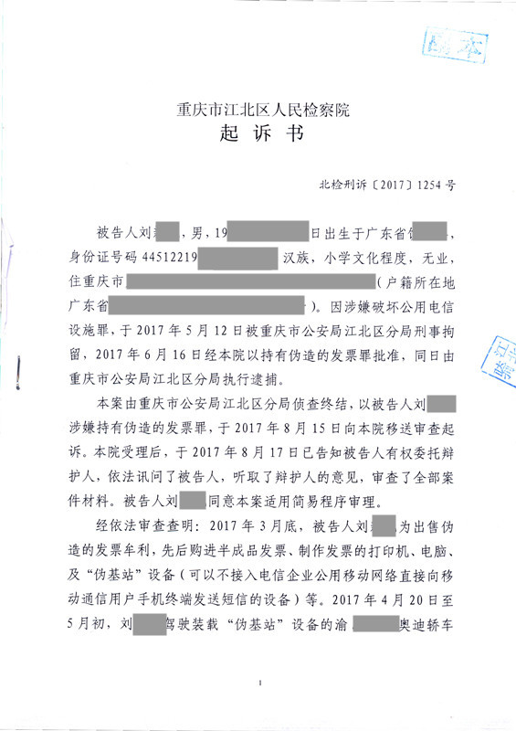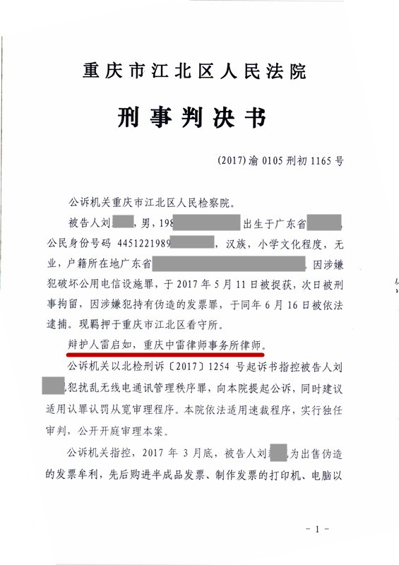 2017年5月,刘某因涉嫌扰乱无线电管理秩序罪被重庆市公安局江北区分局刑事拘留,其家属接到看守所通知后来到我所咨询并最终委托我所为刘某辩护。本案从侦察阶段到审查起诉阶段,再到最后的审判阶段,我所律师都积极参与,多次会见当事人,驱车前往江北看守所,与江北区人民检察院沟通案件。从起诉意见书中可以看出,检察院对刘某量刑建议为有期徒刑一至两年,但经过我所律师的积极有效辩护,最终成功为刘某取得了六个月的有期徒刑,远远没有达到检查院的量刑意见,是一次成功有效的辩护。