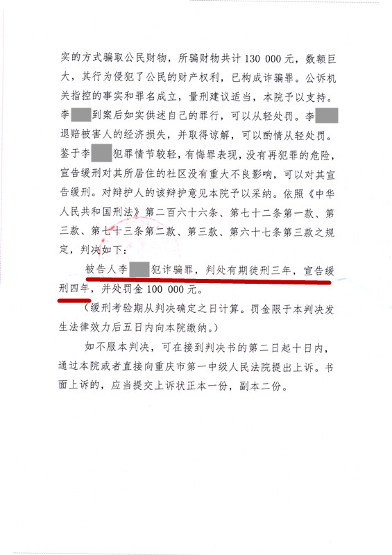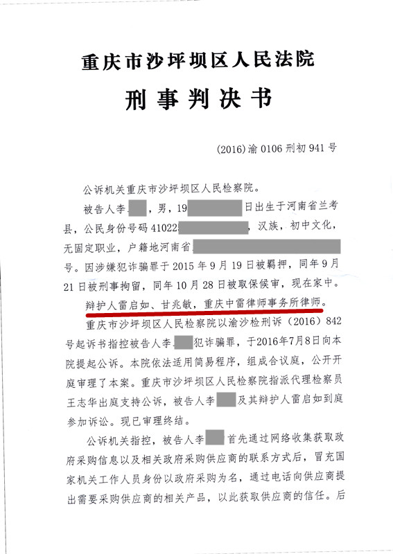 河南人李某涉嫌网络电信诈骗提起公诉。李某通过政府采购网站获知采购单位信息,冒充政府工作人员以政府采购产品获取采购商的信任,要求采购方捎带其他指定产品,通过虚假注册的网站,收取采购商的预付款的方式实施诈骗,诈骗数额特别巨大。雷启如律师接受委托后,查阅案卷材料,积极与承办法官交流,指出李某到案后如实供述,并且积极退赃,获得谅解,有悔罪表现,最终在雷启如律师的努力下,李某被判处缓刑。对于涉案金额巨大,外地人,当前电信诈骗严打的期间,取保候审和判处缓刑非常不容易的情况下,雷启如努力做到了,这才是真正专业刑事辩护能力的体现。