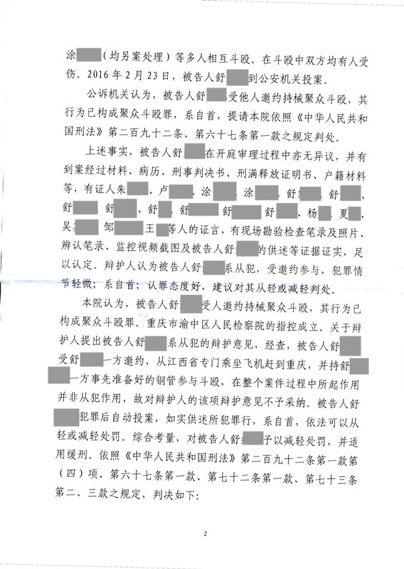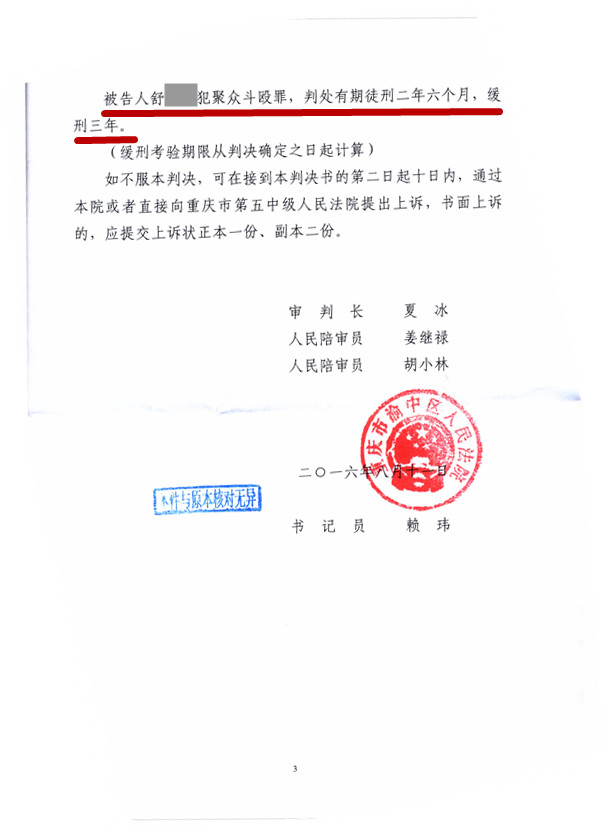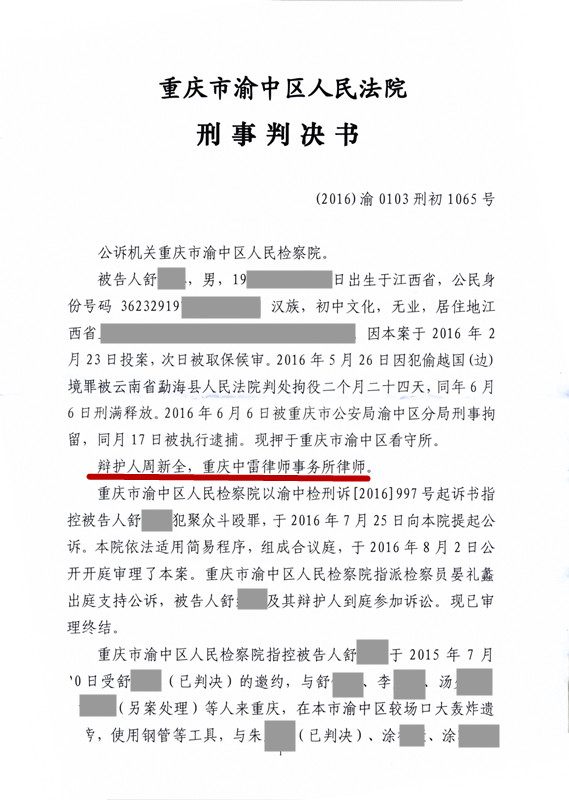 2016年舒某持械聚众斗殴被取保候审,取保候审期间因偷越国境罪被云南法院判刑2个多月。刑满后移交重庆警方被逮捕,后移送起诉,我所承办律师指出舒某虽在取保期间犯新罪,但是有自首情节,积极认罪悔罪,新罪属于比较轻微的罪行,聚众斗殴没有造成严重后果,建议法院判处缓刑。最终在承办律师的努力下,舒某被判处2年6个月,缓刑3年。