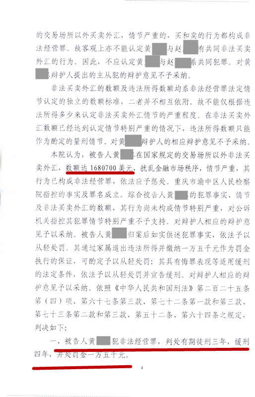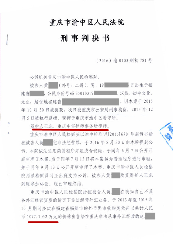 黄某涉嫌非法经营外汇达168万美元被起诉,公诉机关认为黄某属于情节特别严重,建议判处有期徒刑5年以上,律师指出黄某犯罪情节未达到特别严重,属于5年以下的有期徒刑;同时黄某认罪态度好,有悔罪表现,中雷所律师凭借扎实的专业功底及丰富的刑事办案经验,法院采纳了律师意见,判处有期徒刑三年,缓刑四年。